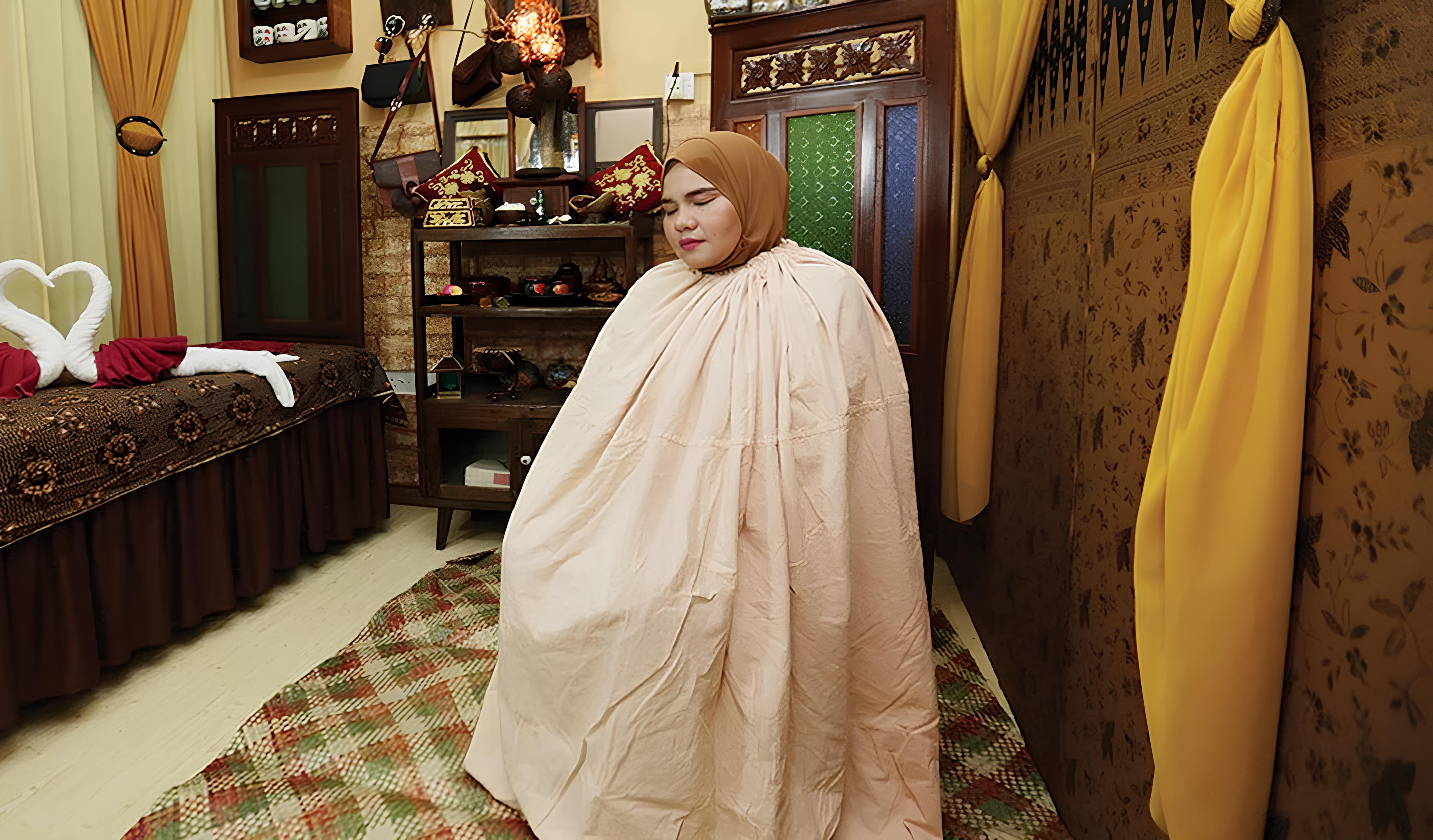 Selubungkan kain tangas, kain tebal atau kain batik di sekeliling tubuh supaya asap herba terperangkap dan meresap ke bahagian intim serta tubuh.