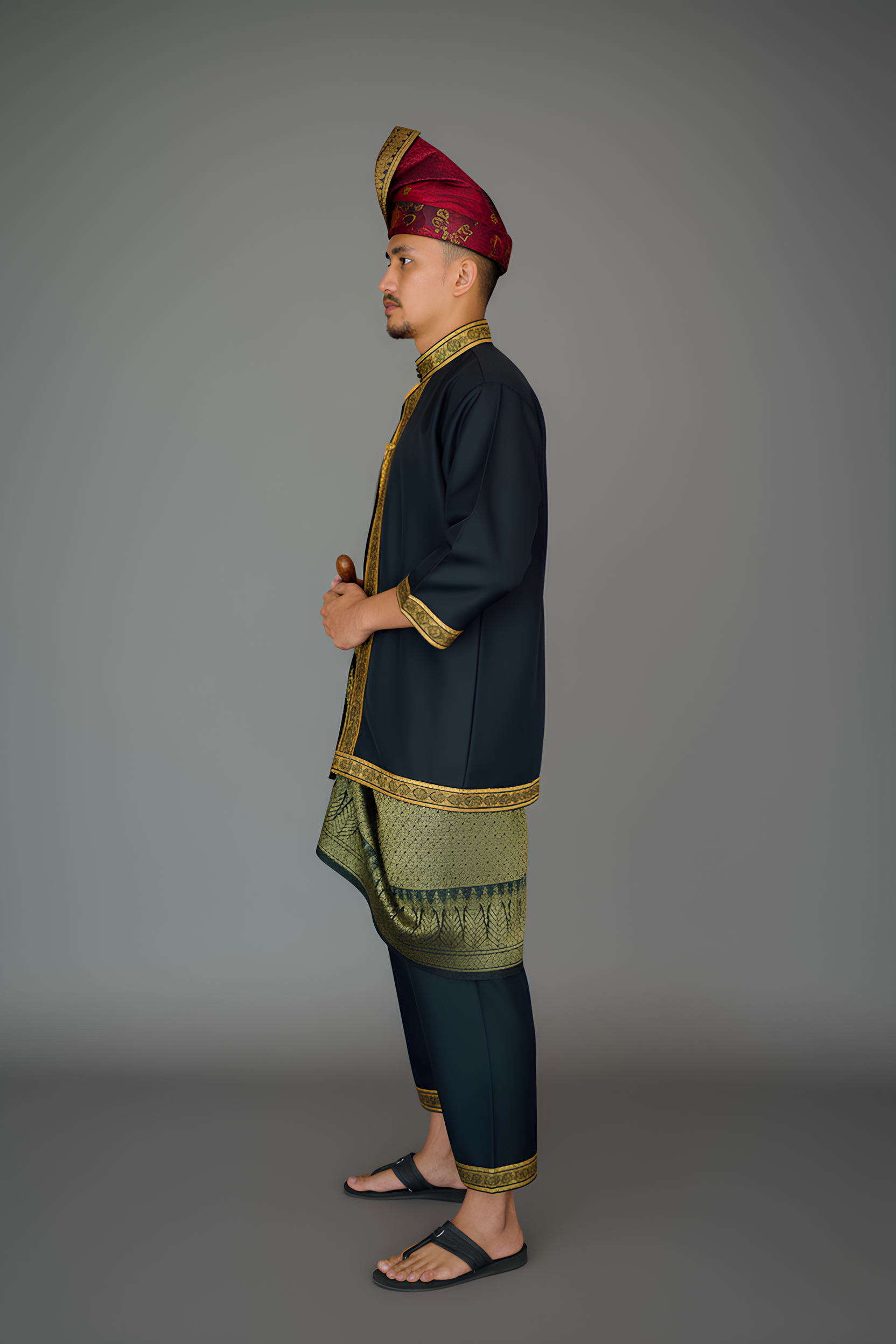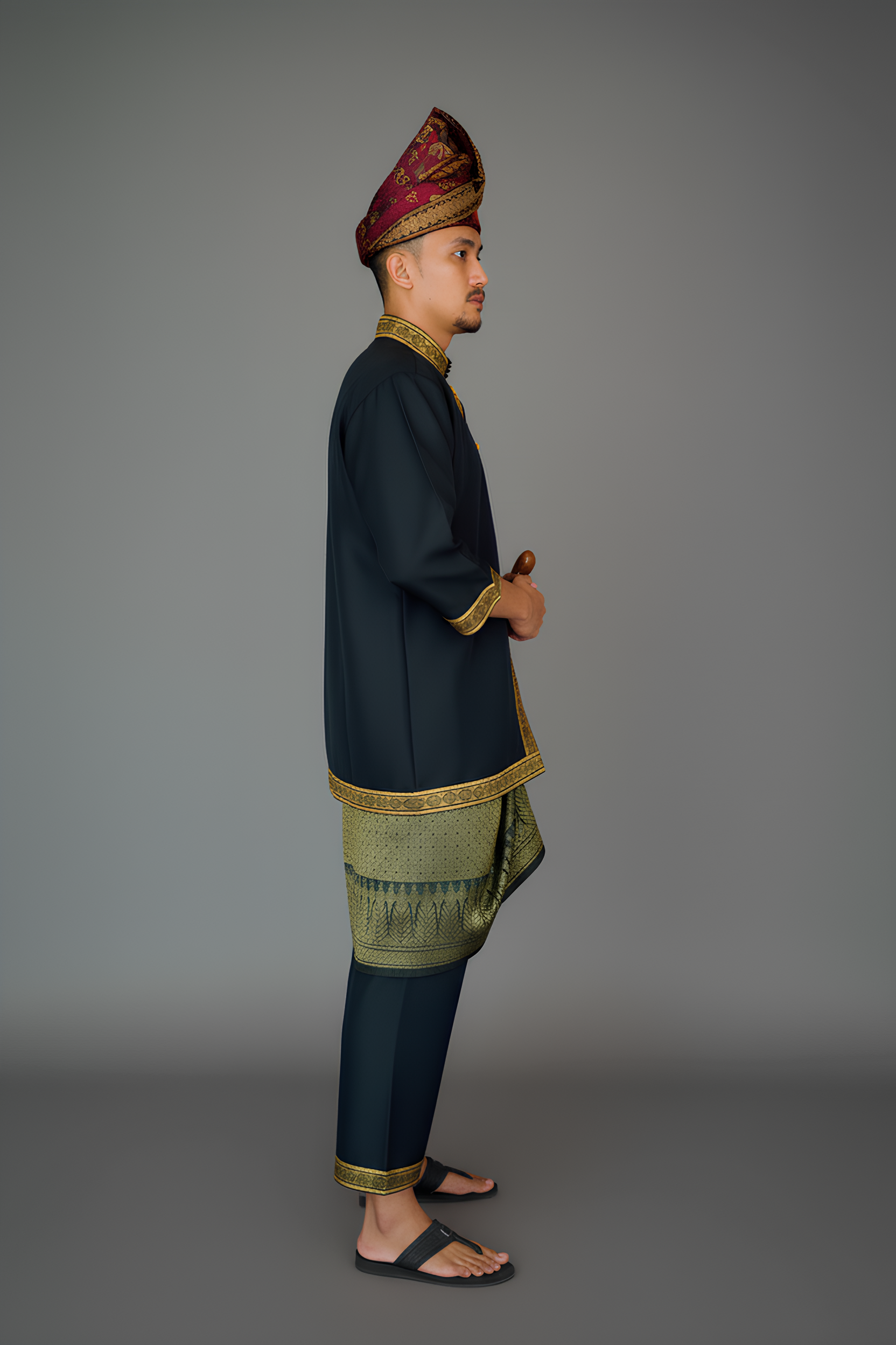 Selain itu, terdapat juga penggunaan kain tenun hitam berjalur emas, melambangkan keberanian dan kesetiaan kepada sultan.