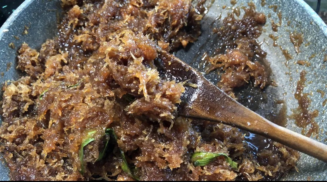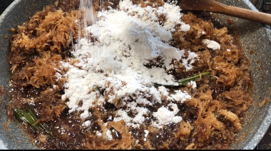 Masukkan kelapa parut, gaul rata dan teruskan memasak sehingga inti hampir kering.