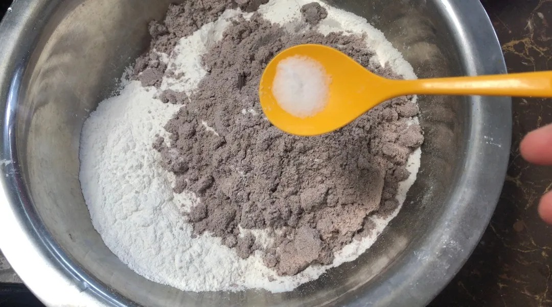 Foto 5: Satukan tepung pulut, tepung pulut hitam, dan sedikit garam.