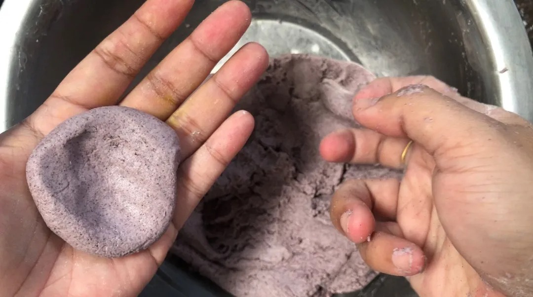 Masukkan air sedikit demi sedikit sambil diuli sehingga adunan menjadi doh lembut seperti adunan kuih buah melaka.