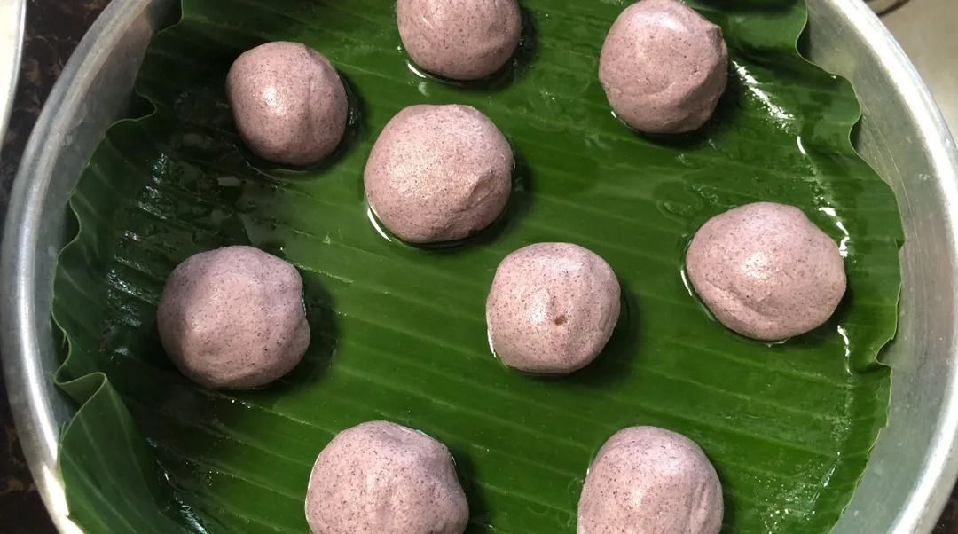Tutup inti dengan doh dan bentukkan menjadi bebola bulat. Susun bebola doh di atas daun pisang yang telah disediakan.