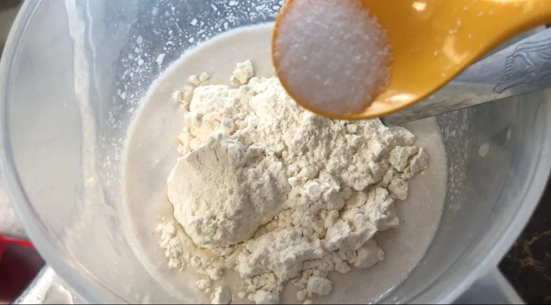 Dalam mangkuk, satukan santan, tepung gandum, garam, dan gula. Gaul hingga sebati.