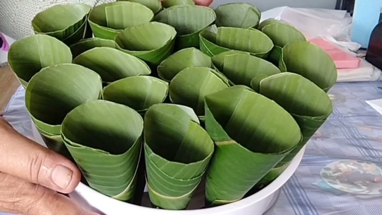 Potong daun kepada saiz yang sesuai, kemudian gulung membentuk kelongsong kon memanjang.