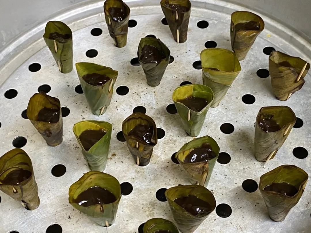 Tuang adunan bahagian bawah ke dalam setiap kelongsong daun pisang, lebih kurang separuh penuh.