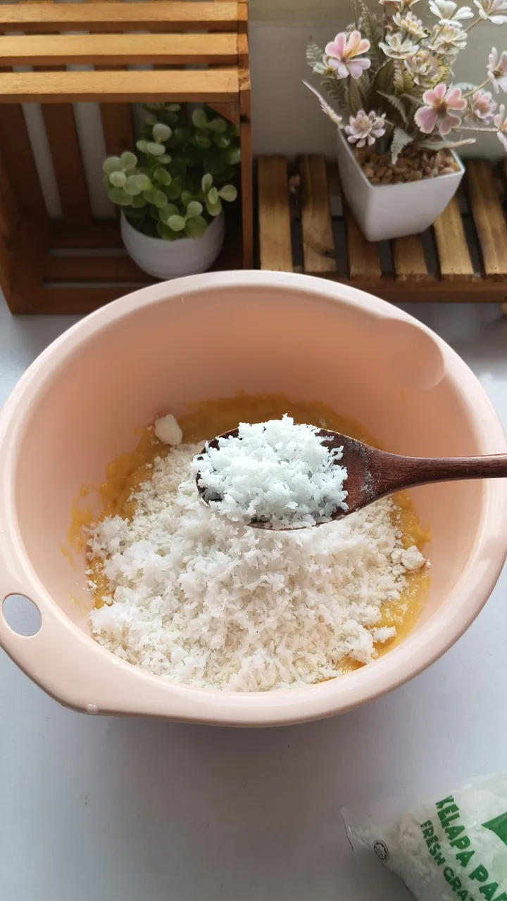 Masukkan gula putih, gula Melaka yang diparut, tepung gandum, tepung beras, kelapa parut, dan sedikit garam.