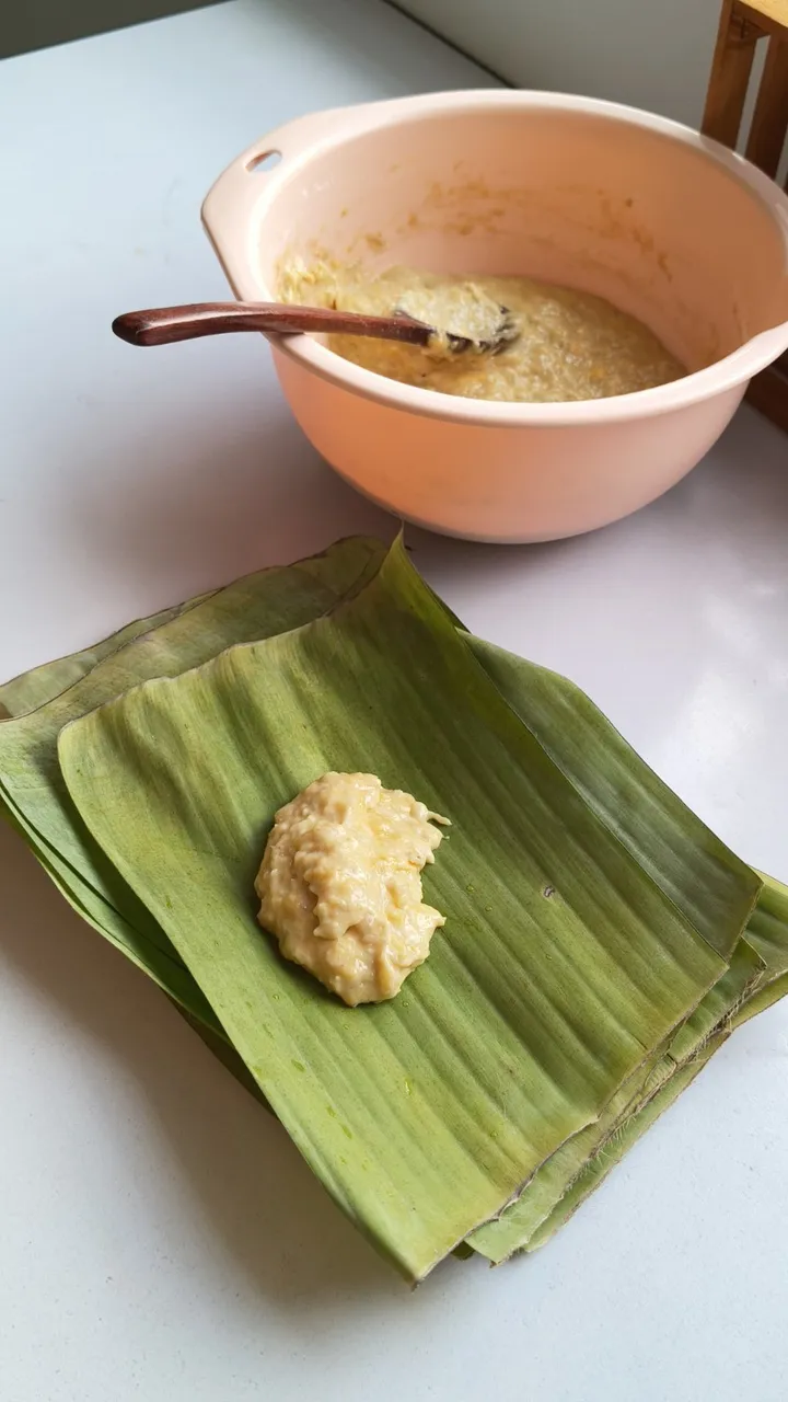 Ambil sehelai daun pisang, letakkan kira-kira tiga sudu besar adunan di bahagian tengah daun.