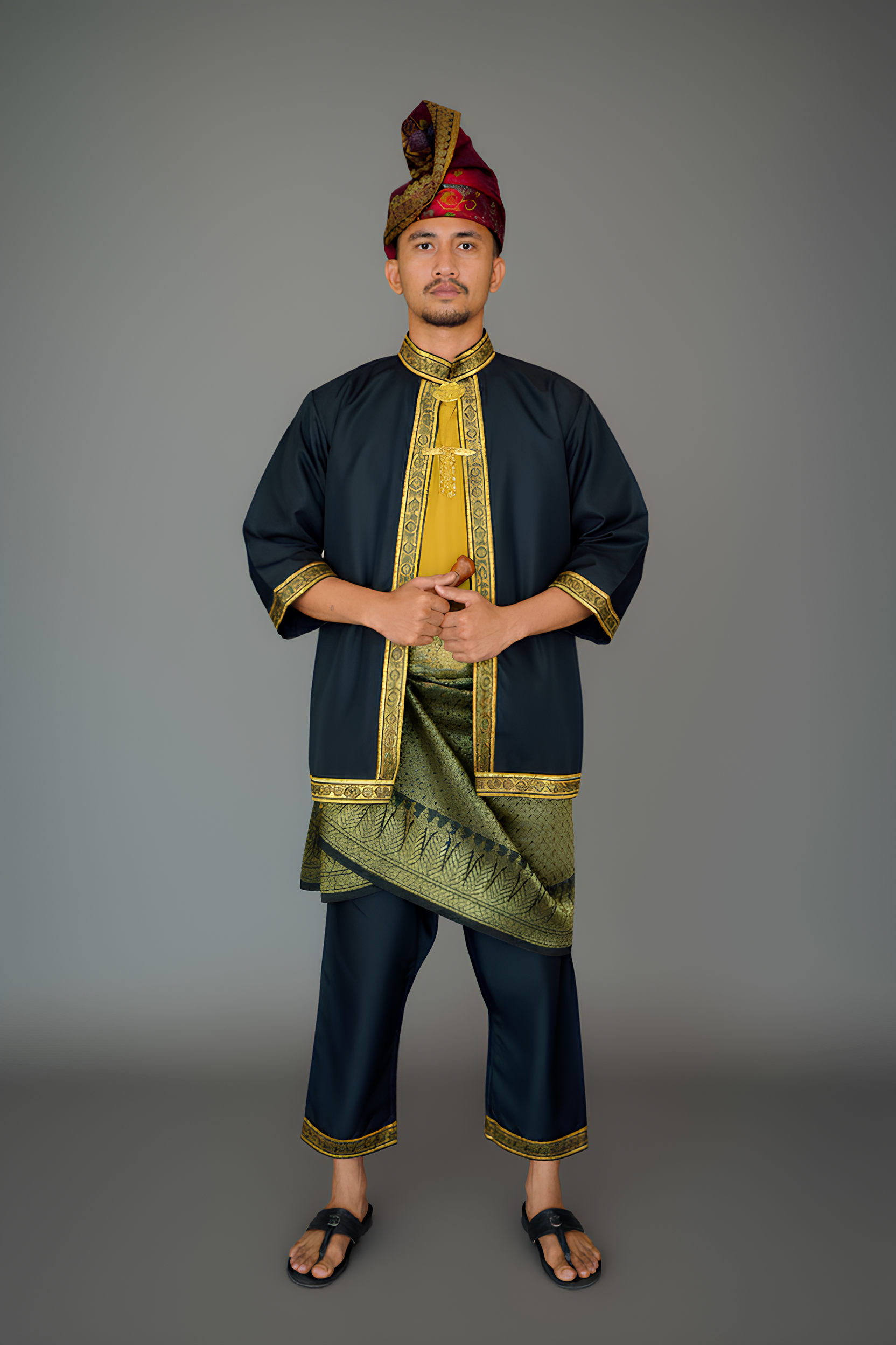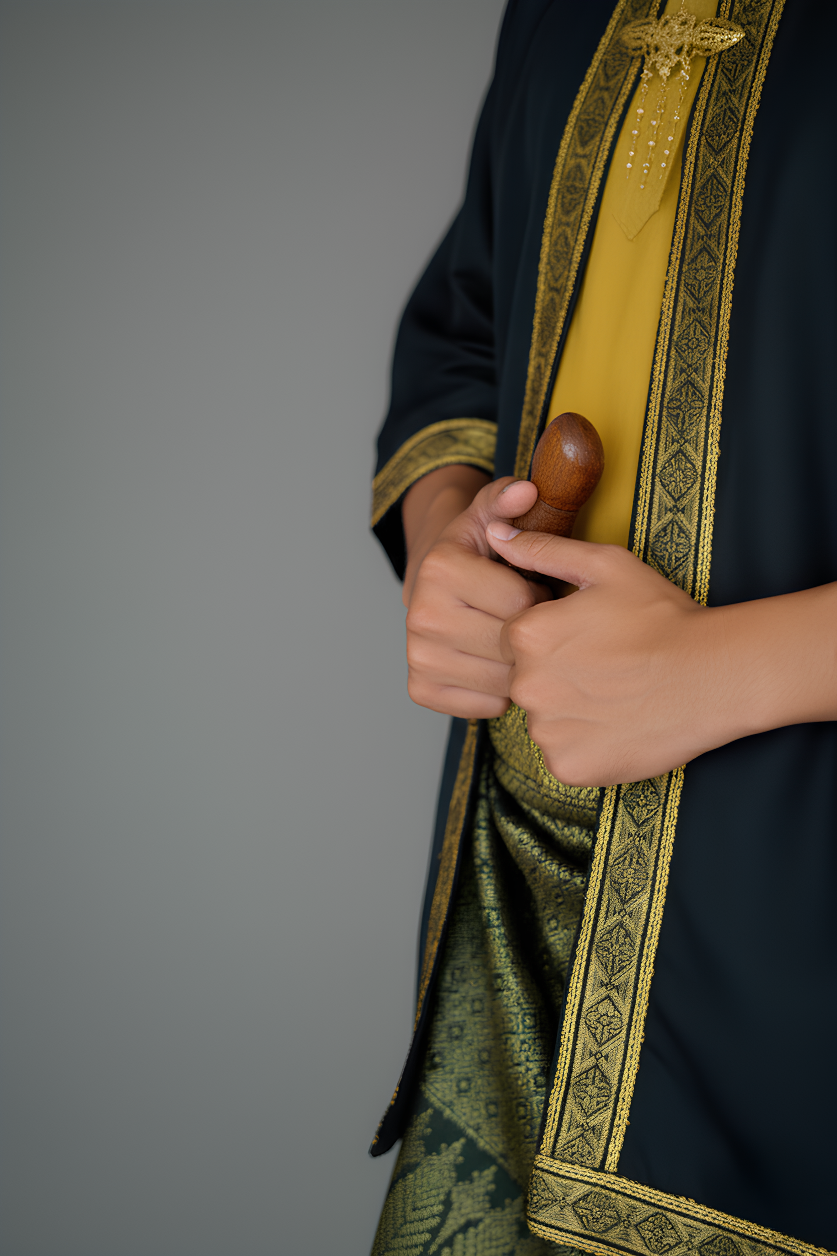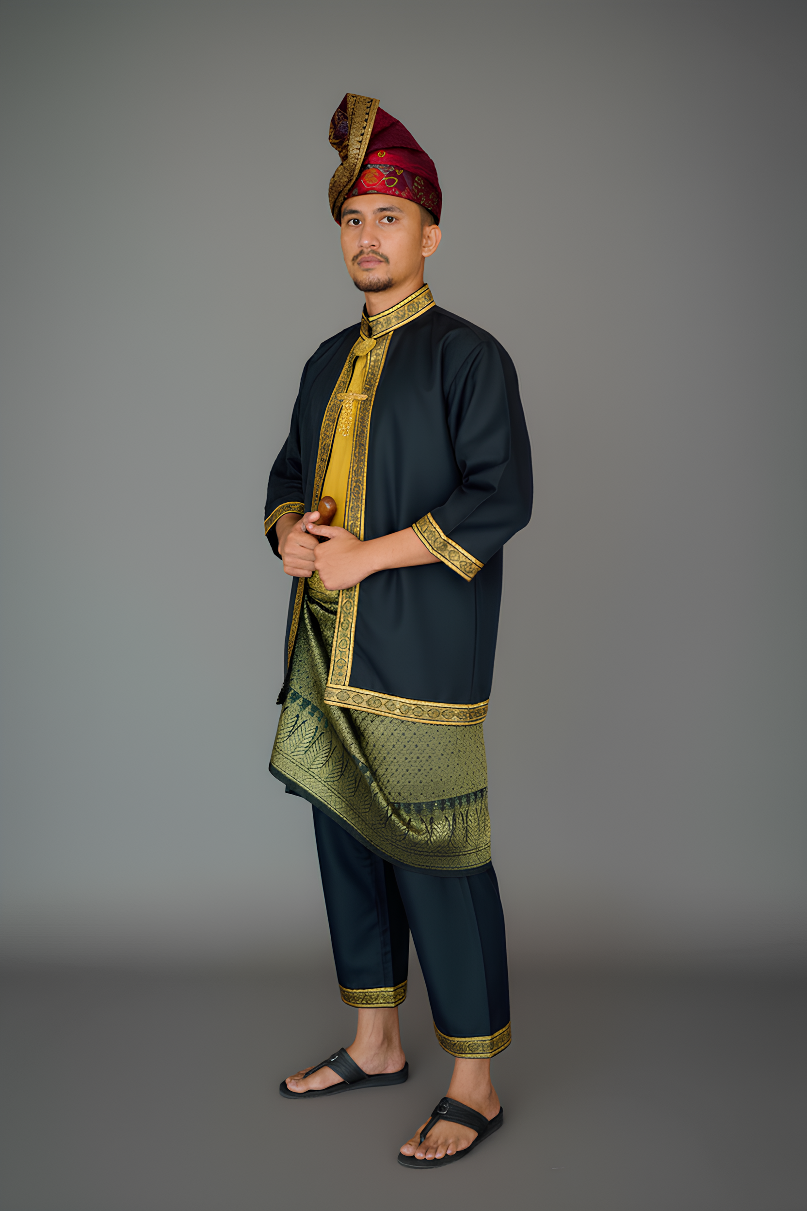 Selain itu, terdapat juga penggunaan kain tenun hitam berjalur emas, melambangkan keberanian dan kesetiaan kepada sultan.