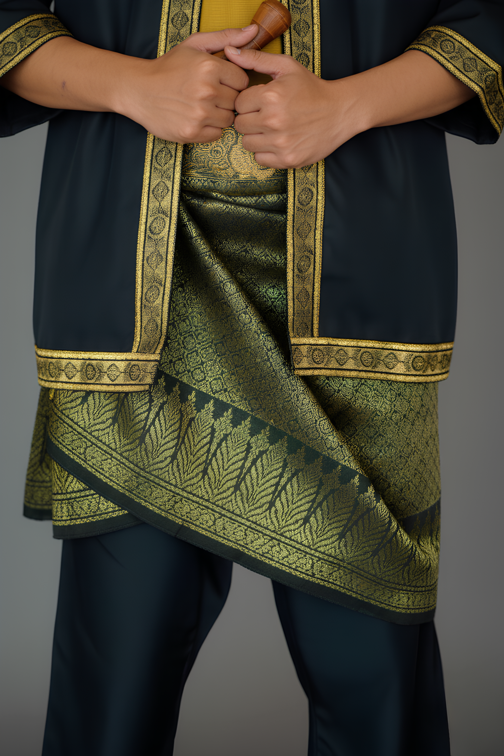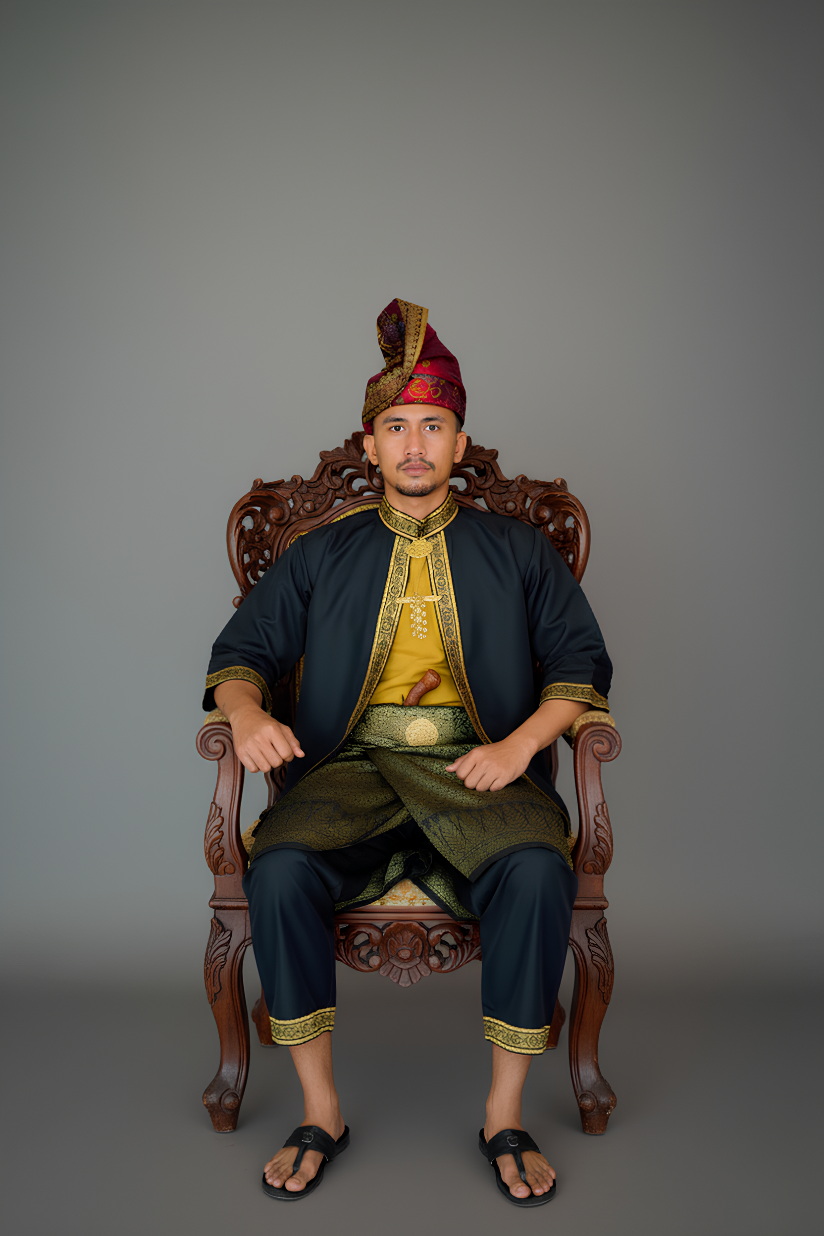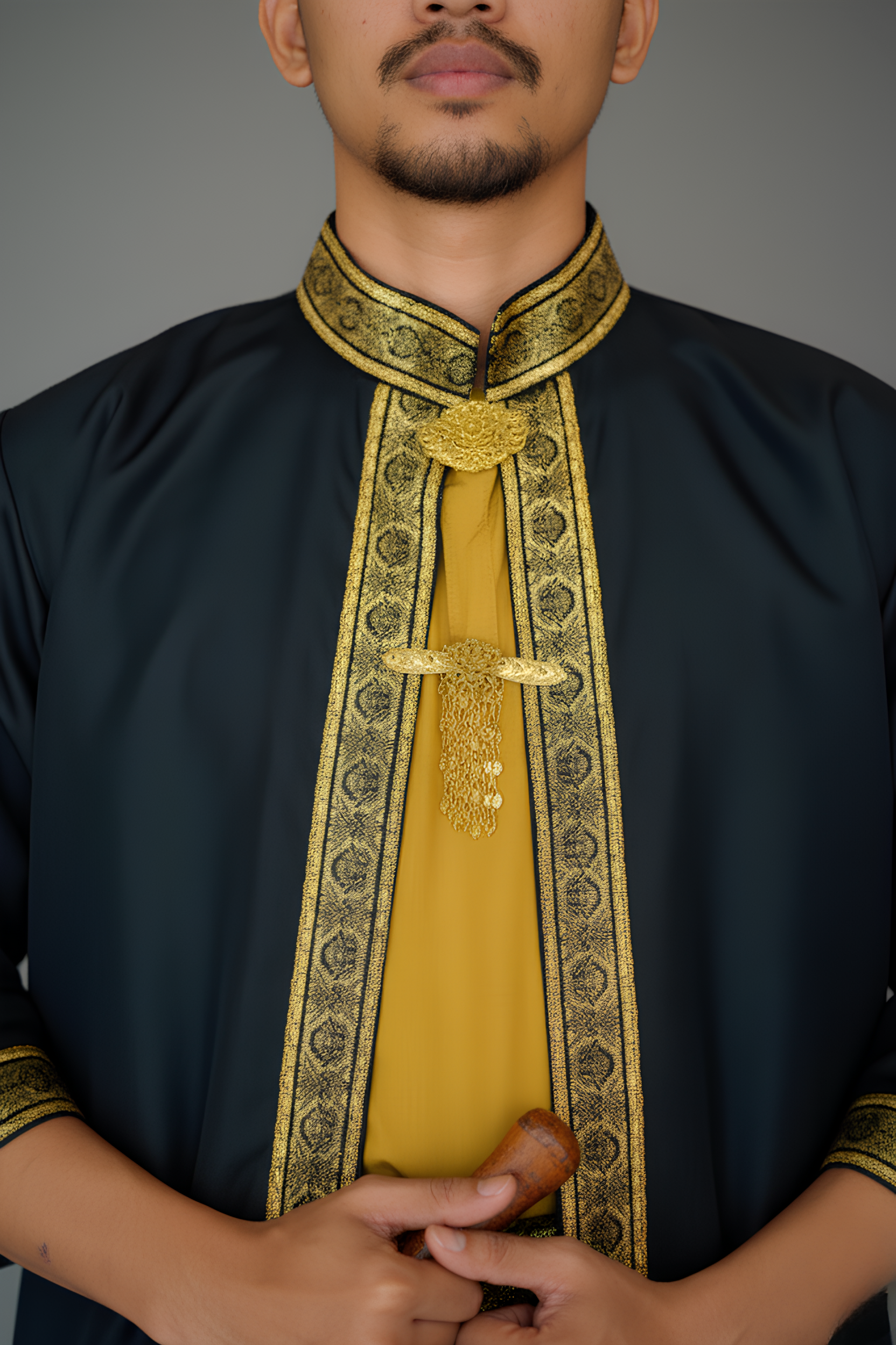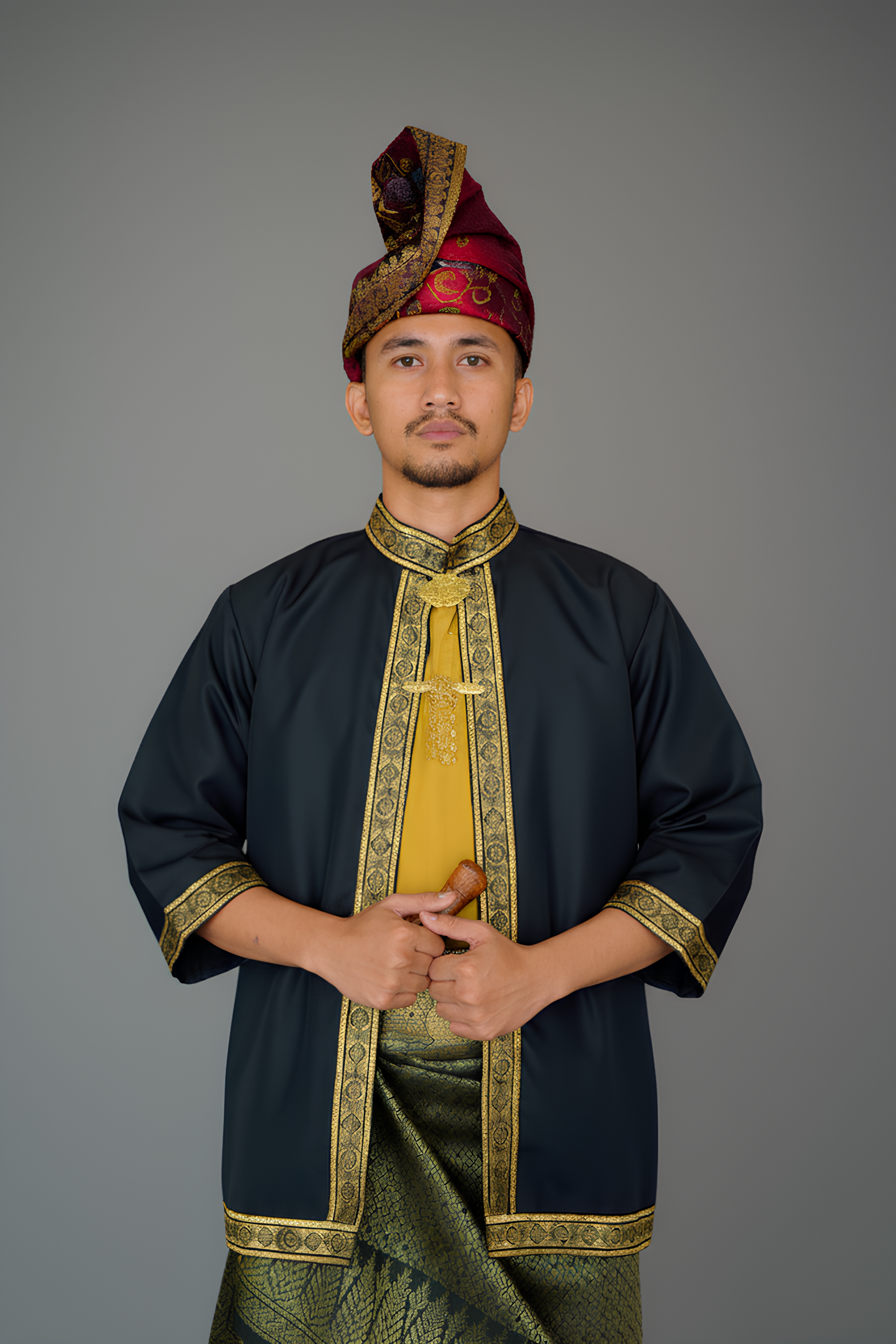 Selain itu, terdapat juga penggunaan kain tenun hitam berjalur emas, melambangkan keberanian dan kesetiaan kepada sultan.