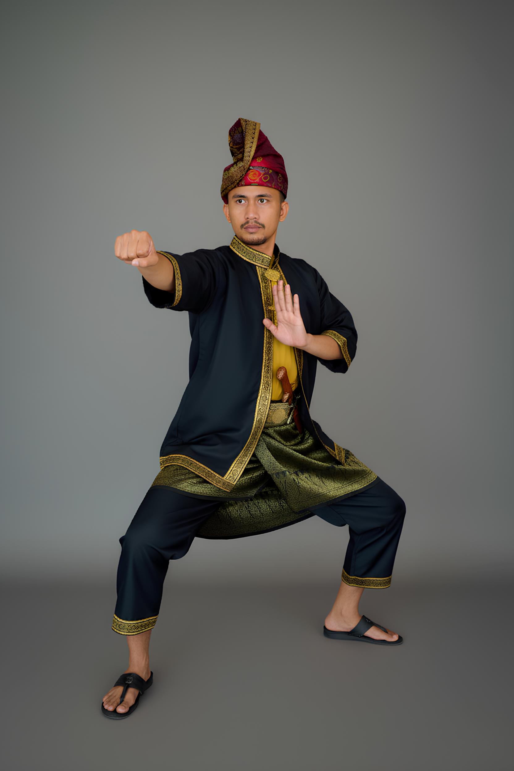 Selain fungsi istiadat, busana ini turut berperanan dalam konteks peperangan. Rekaannya yang ringkas tetapi kukuh memudahkan pergerakan pantas di medan tempur. Seluar longgar dan samping yang diikat kemas di pinggang membolehkan pahlawan bergerak lincah ketika bersilat, menangkis serangan, atau mengatur strategi pertahanan. Di samping itu, tanjak dan bengkung bukan sahaja sebagai hiasan, tetapi berfungsi mengikat badan dengan lebih tegap, memberi sokongan ketika pertempuran. Justeru, busana ini membuktikan keupayaannya menggabungkan elemen praktikal dengan estetika, menjadikannya sesuai untuk fungsi pertahanan.