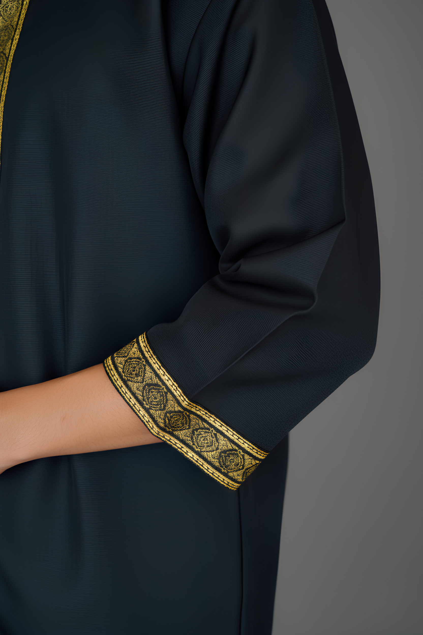 Pemakaian dimulakan dengan menyarung baju Melayu potongan teluk belanga pada bahagian dalam, lazimnya berwarna gelap seperti hitam atau biru kehitaman.