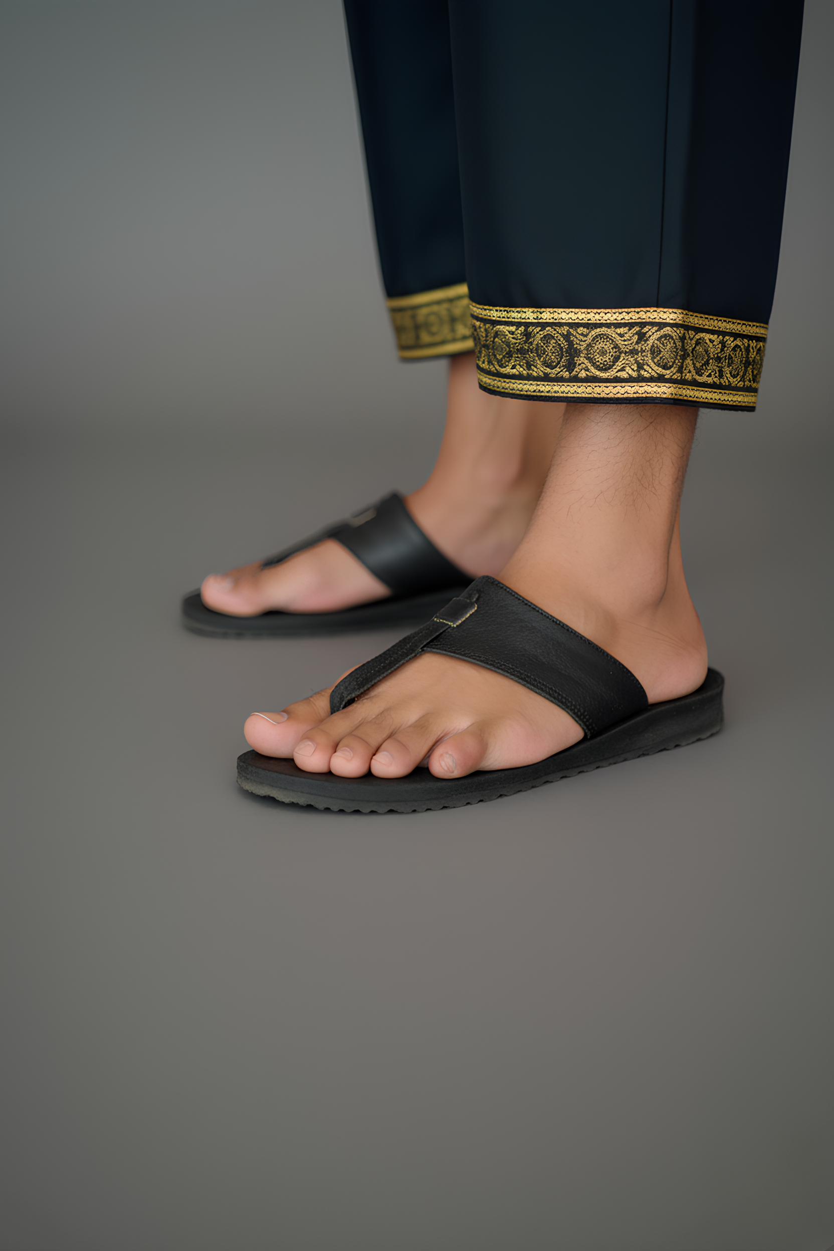 Pemakaian diakhiri dengan menyarung capal tradisi atau selipar kulit, ringkas tetapi kemas.