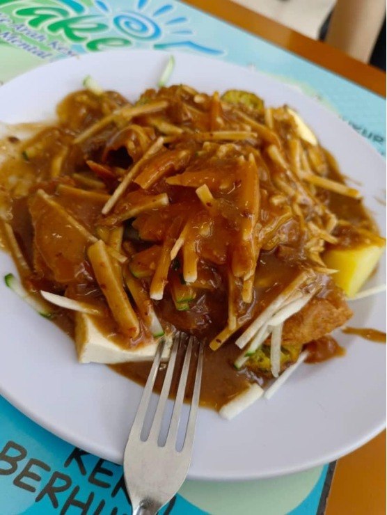 Semua bahan hidangan disusun di atas pinggan dan disiram dengan kuah kacang secukupnya sebelum dihidangkan.